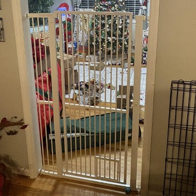 Unfortunately the gate does not stay in place, it falls off and after hours of multiple family members trying on different days to adjust the tension the frame does not have anything on top to keep pet door solid that would keep the top two pieces apart (like the bottom solid frame) so it just collapses. Need to return.
