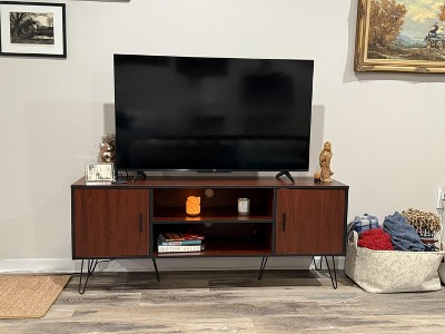 This elegant retro 59-inch TV stand will add charm to your living room. Composed of metal tapered legs and engineered boards with teak wood grain, it not only looks attractive, but also has good durability and stability. And there are two side cabinets for enclosed storage and a central open shelf, creating additional storage space in your home for media devices, electronics, accessories, books or decorations. Therefore, it can be used as a TV stand in the living room, a locker in the bedroom or a storage cabinet in the entryway.