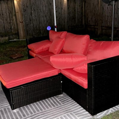 This set was the lowest price sectional outdoor set we could find. The quality is quite high and the size is more than decent. So far, the set is holding up quite well. The only thing I wish is the pillows could be attached to the seats. In high winds, the pillows just fly off.