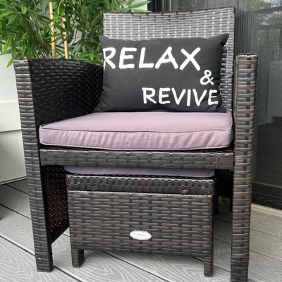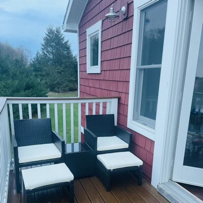 This is a cute little set. Not too fancy, but we use it on our apartment balcony & it’s perfect. The quality isn’t top tier which should be clear by the price. We do not cover the set and with a month the cushions faded from the sun. We’re not upset by this, but it’s worth mentioning (see photos). It was mentioned in another review that the foot stools will not go under the seats with the cushions of them. They will fit, you just have to lift the chair and slide it under. Chairs are very light weight. I assume the set would blow away easily in a windy environment. Overall, we’re happy with the purchase.