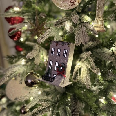 This tree is very life-like. Branches with snow on the tips. It's so pretty it really needs no ornaments. I only used sheer ribbon and a few ornaments.