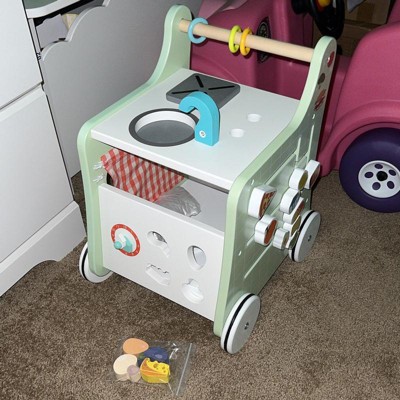 My one year old grandson is using his kitchen cart to practice walking, he loves to pretend eat the ice cream cones and puts toys inside the body of this toy. All around great quality and durable!