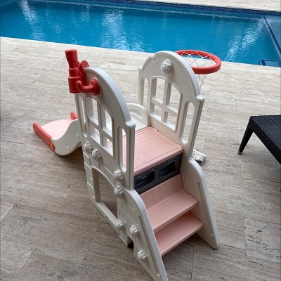My 2yr old Granddaughter loves her slide an the basketball hoop. She\'s tall for her age an she can get the ball in. Pretty sturdy easily put together but will need 2 people. Worth it.