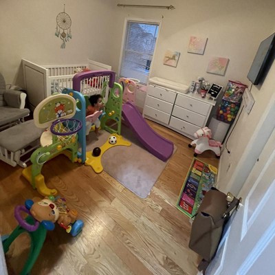 My daughter is 17 months and plays with this at least an hour a day inside the house (cold winters). She loves the rings and slide. Puts a teddy bear on the swing and pushes it. And then asks to sit on the swing. Likes the basketball hoop also. The swing makes creaking noises which is the only major con so far. Took about 30 minutes to set up. The directions are terrible though. I zoomed in on website pictures to really figure out how to set it up. Overall I do like it and definitely got my moneys worth already.