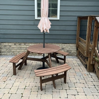 The 6-Person Round Picnic Table Set is perfect for outdoor gatherings. It comfortably seats six people and the umbrella hole is a thoughtful addition.