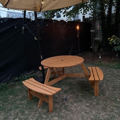 Round outdoor table with 3 benches easily accommodates 6 people