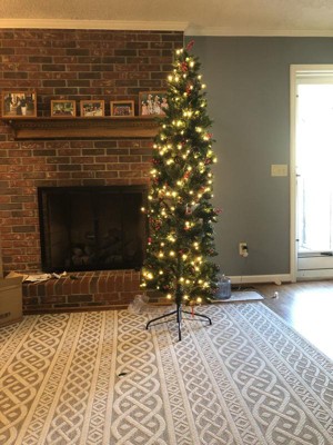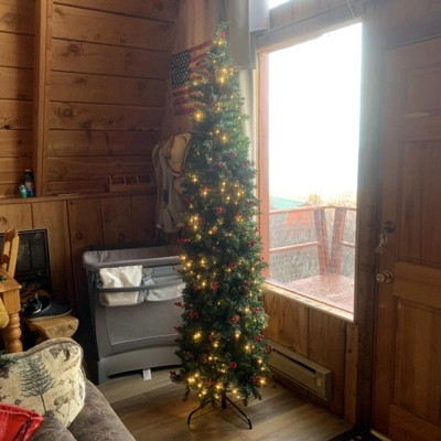 Don't worry about having no space for a Christmas tree. Its slim shape is great for displaying in small room and tight corners with limited space. Lush PVC branch tips with cones and red berries will help to simulate an extremely real Christmas tree. Comes with LED lights and UL certified plug adapter, this tree provides sustainable lighting for the whole holiday. What's more, hinged design makes assembly easy and quick. It is an attractive addition in party, Halloween, Christmas, etc.
