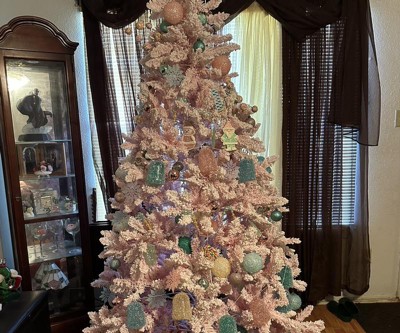 Our pre-lit artificial Christmas tree measures 3.9 ft x 7.5 ft (Dia. x H) and features 1100 dense branch tips, which are luxurious and vivid while providing enough space for hanging a variety of beautiful ornaments, and you can enjoy happy decorating time with your family. Instead of using ordinary green or snow white, our Xmas tree adopts pink colors, giving it a more eye-catching and beautiful look. And covered by beautiful flocked snow, the tree looks vivider. The leaves are made of sturdy and flame-retardant PVC material, ensuring a long service life. More than that, it is designed with 450 pre-strung warm white LED lights in 8 lighting modes, making the night full of a holiday feel. The branches are connected with the trunk by convenient hinges, which can automatically spread out, saving your time and energy on installation. Whether as a holiday decoration in your home, office, or school, or as a wedding, birthday, or ceremony decoration, our pink Christmas tree can be a perfect choice!