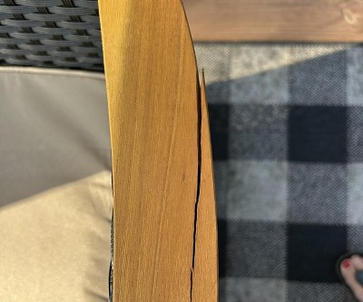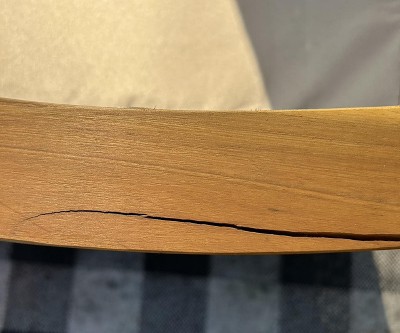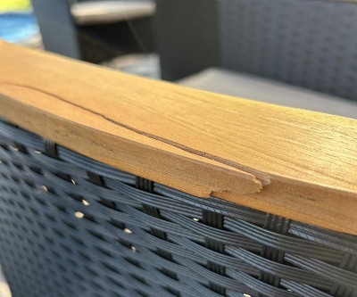 I have only have my set put together for a week and one of the wood chair arms has a huge crack in it. I do not want someone to set in it. They may rip there clothes I would be happy with a replacement chair.