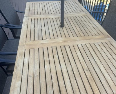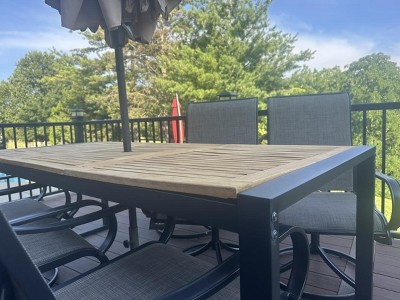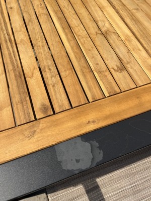 Love this table but sadly after a couple weeks you can see stains on wood and metal from rain. Also seeing a few slats of wood warping from rain. This is sadly not great quality for outdoors but would be great for indoor covered patio.