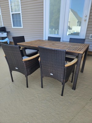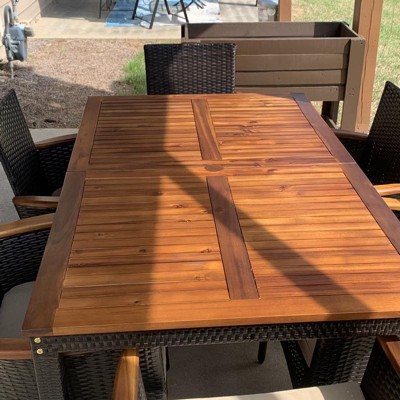 Our 7-piece outdoor dining set provides a good gathering place for you and your family or friends. Made of high quality acacia wood and rattan, the patio dining set ensures incredible durability and long service time. Also, the reinforced structure and solid steel frame enhance the stability and load bearing capacity. It provides spacious space to sit and a large dining table is convenient to hold food and drinks. In addition, the chairs with ergonomic backrests and armrests provide optimal comfort when sitting on it. With 2.16'' umbrella hole, you can enjoy family gatherings or other outdoor activities with larger shade. This rattan furniture set goes well with various home style, which is ideal for backyard, poolside or garden. Don’t hesitate to take it home!