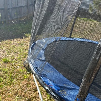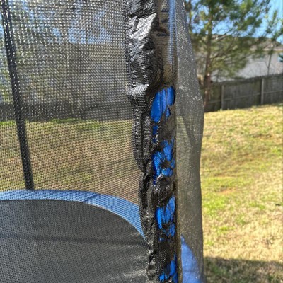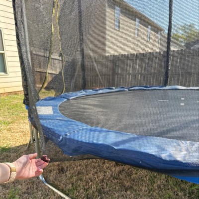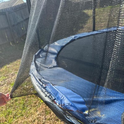 The netting connects to the outside of the blue safety cover (covering the springs) and leaves a hole big enough for smaller children to fall through. Also, we put the trampoline up on December 23rd, it is March 24th and there are holes in the netting that looks like it’s been burned by the sun but it hasn’t even been hot here. The trampoline itself is fine, the safety netting is dangerous.