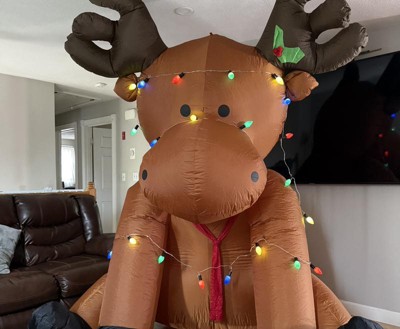 This piece is very fun! This piece is very easy to assemble and display. I recommend this product as the lights are very fun and it is a huge inflatable that really brought a cartoon element to my display. Love this reindeer.