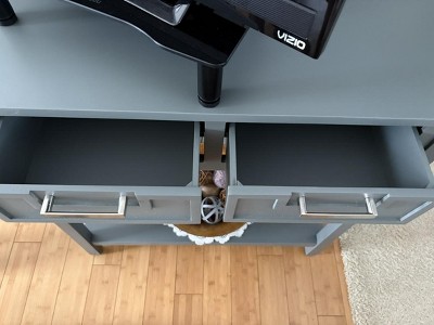 This table was perfect for what I needed it for! I would have liked a little taller table but just put a riser under the tv and problem solved! The color was an excellent match for my decor. The drawers are not the greatest since they go not have any brackets but not a big deal for me. The price was less than I expected to pay! I call it a win in my opinion!