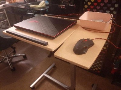 Laminate is pretty cheap but the DESK is pretty cheap, pretty fair for the prices. wheels aren't the best but aren't the cheapest I've encountered lately. i have some issues getting it to lock in at a certain angle, tends to be a bit unsteady, but the black bumpers make it so nothing has ever fallen off. if the small side is supposed to be level, idk how to get it that way. The entire top is a bit tilted inwards after assembly and I found no way to get it level, so you sure aren't gonna be able to safely put a coffee mug there. Lack of the edge bumper also means that your mouse may fly off if you use one over there like I did. that's really only been an issue a couple of times. the second photo shows the large part leveled with the side part pitched inward to show what I mean. wish the side had a bumper but oh well. I affixed a small container to it to hold smaller items like flash drives and hard drives that would slip off. the up and down range is GOOD. i can use this next to my work desk and raise it enough to put it next to my bed and still fit my legs under it!