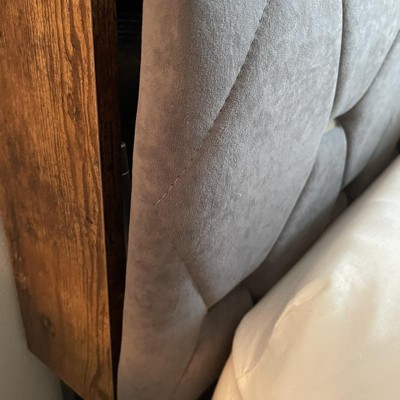 This item had a storage headboard, which is why we ordered it. The color of the wood is a dark walnut and the footboard and sides are like a faux velvet darkish grey. We didn't know that the tufting has metal bars in the center and those look cheap (wish they weren't there at all). Also, some of those metal pieces look dull from moisture damage and can't be cleaned. The hardest thing was putting it together!! There are a million screws and the tufted door part of the headboard is too heavy for the assembly. I followed the directions in order and recommend you put the hinges on first and then do the rest. It was so heavy and required so much force when screwing those in, that the middle hinges ripped through the screws I had just done and I needed to reinforce those with super glue for it to work. All in all, the most annoying piece of furniture I have ever put together. If you can find something else with storage, if that's your need, get that.