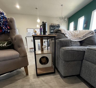 I was really nervous to order this because it didn’t have any reviews but I’m glad I took a chance! It works great as an end table in our living room and our cats love it!