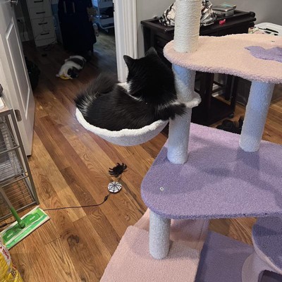 I recently purchased this cat tree, and my cats absolutely love it! First of all, this cat tree stands out in terms of color compared to others. It\'s purple and looks great in the house. Secondly, the design is very sturdy; even when my cats jump and play on it, there\'s no wobbling. It also has multiple platforms and hammocks, providing plenty of space for the cats to rest and play. The assembly was simple too, with clear instructions. I easily set it up by myself in half an hour. For the price, this cat tree is definitely worth it. I highly recommend it to all cat owners!
