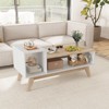 Boasting a 43" long tabletop and 2 open compartments for easy organization, it provides ample storage space. The coffee table's stable splayed legs and protective foot pads ensure durability and floor protection. Its chic color-blocking design exudes a trendy mid-century modern aesthetic. With a 5" high clearance underneath, sweeping is a breeze. This versatile piece is perfect for living rooms, studies, reception areas, and more. More user-friendly details await your discovery.