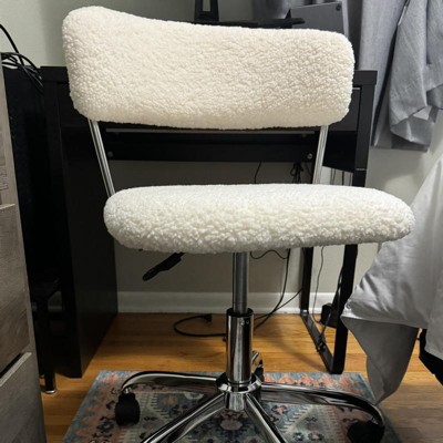 Enjoy your leisure time or working hours with this Faux Fur swivel chair! It creates a cozy space with the furry Faux Fur cover and thick sponge padding, giving you the optimal comfort. Besides, the built-in plywood board and sturdy galvanized steel frame ensure a reliable support for different users. And users of different heights can find the ideal position thanks to the adjustable seat design. Sitting on the computer desk chair, you can swivel by 360 degrees and easily go anywhere you like, as the rolling casters allow flexible movement. With all these features, you can use this armless chair as a computer desk chair, a vanity chair or a leisure chair, and enjoy it in different rooms.