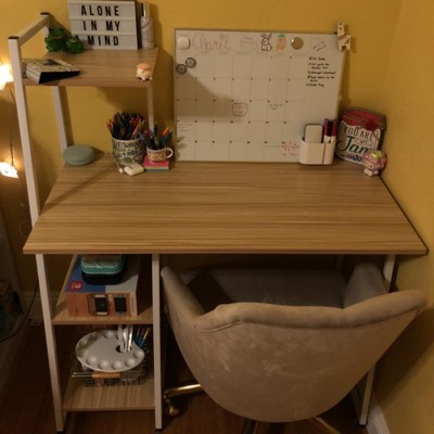 This desk is super cute. I like shelving and wood design but it's a lot smaller than I thought it would be.