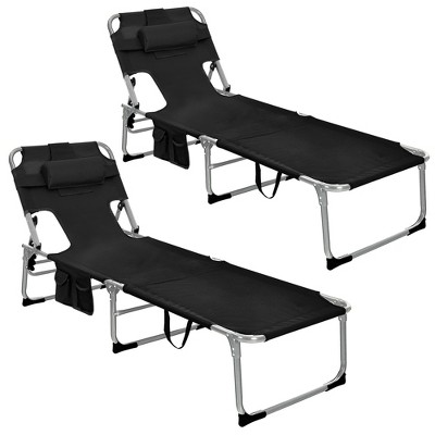Have been looking for lounge chairs for a year now and SO many of them are $150+ each chair (sometimes with no pillow)! Which I get, there is quality to cost to consider for an outdoor piece of furniture, but this was honestly an amazing find and deal. The lowest you can lay back isn't flat but it's pretty close to it and that's just fine by me, let's you sip on a drink easily if you aren't fully flat. The cushions even have a little pouch that hooks over the chair so they don't wiggle around on the chair. 10/10 can recommend!