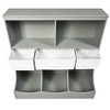 Take a look at our children's three-tier cabinet! The stylish exterior makes it suitable for any room! Such as children's room, recreation room or living room. Its structure features two spacious open shelves, three non-woven drawers of different sizes, and three small bins. Shelves can be used to store books, magazines, DVDS, video games, etc. Drawers can be used to hold children's gloves, clothing and accessories. Our bottom three bins are ideal for sorting items, such as craft supplies, dolls and other toys. Also, the top surface provides an e xtra place for a photo frame or souvenir.