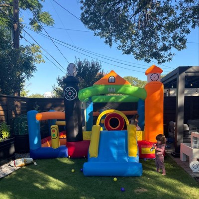 - 6 in 1 Inflatable Bouncing House: This bounce house is designed with large bouncing area, a slide, ball pits, ball and ring toss game, and a basketball rim to satisfy different entertainment needs. Recommended for kids 3-10 years old.