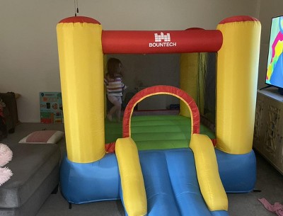 This is a great little bounce house. I was a little worried it would be small for our average sized 5 year old but he loves it. The basketball hoop is great to have. It’s easy to set up and blows up fast. We use it outside but are planning on being able to use it inside in the winter. We’ve had it about a month and no issues so far.