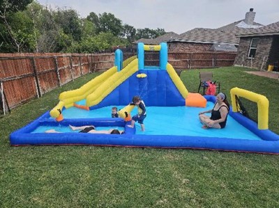 - 6-in-1 Endless Fun: Our inflatable jumping house is specially designed to provide kids with various activities. Kids can enjoy the exciting water slide, climbing, shooting, football match, water playing, and water gun battle with friends. Make sure to bring kids a wonderful summer.
