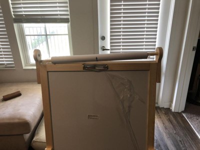 The roll where the paper goes like in another review says .. I have the same problem , it does not reach and fit properly so it keeps falling . Also chalkboard is very scratched up. One of my biggest disappointments of this purchase is the instructions start off in english and then third page switch to a whole other language: so I basically built it from looking at the drawing and common sense . Would not recommend . Especially because it’s not a cheap item . Save your time and money !!!