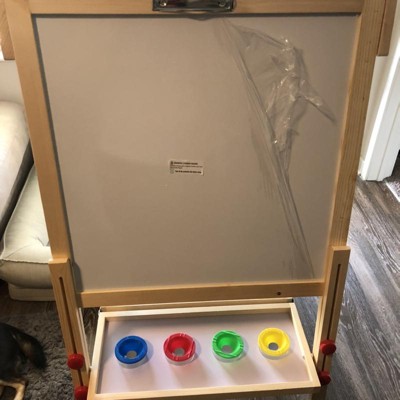 I'm just curious as to how you can sell an easel with ALL the things minus paint brushes & paint. It makes me laugh at all the other BS sent with it but the fact paint brushes & paint is where they decided to dry the line. Like, "Nope! We refuse to have this come with paint & paint brushes to go alone with the 4 crappy paint cups!" Other than that, it seems nice. The chalk board & the white board will have to be cleaned using something wet because the brush provided does not work at all in erasing anything. Thankfully I ordered the Melissa & Dough paper roll, paint brushes & paint set in addition with the purchase of this easel. I guess you get what you pay for.