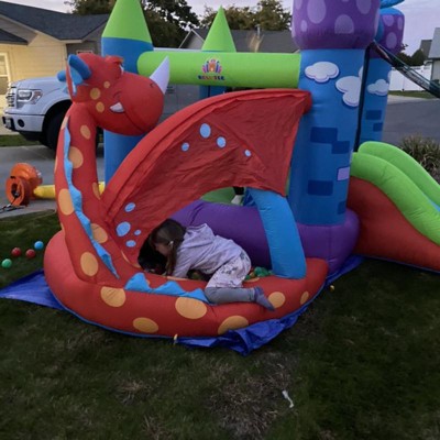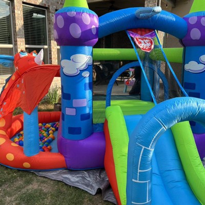 Large jumping area and very durable. Comes with a ball pit. The slide is a a lot of fun for the kiddos as well. Looks like a castle with a dragon. Comes with balls but we had to buy more to fill up the area where the ball pit is. The kiddos can play on this for hours. Make sure you nail it down or it will start moving slowly as the kiddos jump on it.