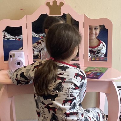 Our kids vanity set is a perfect present for your little girl. The vanity set has been tested from EPA and the paint we choose is lead-free and has no peculiar smell. Made of premium density board, the whole vanity set is very sturdy and can be used for long time. Comes with a tri-folding mirror, your little one can adjust the angle of mirror conveniently to get much light and make up better. The dresser also has a drawer to help store small items such as hair ties, brushes, makeup, nail polish and other fun trinkets. In addition, the mirror can be removed and the table is also can be used for writing or reading. Designed in pretty and cute appearance, the vanity set will add a touch of elegance to your child's room.