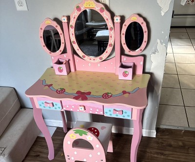 - Cute Appearance & Large Storage Space: Featuring cute strawberry and flower patterns on the surface, this pink vanity set will be a perfect gift for your kids. The tabletop is large enough to display your kids' beloved items; meanwhile there are 3 drawers and 2 small girds to store their own jewelry, cosmetics, combs, brushes, etc.