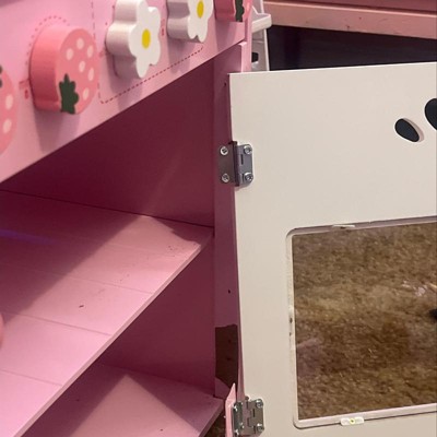 This wooden kitchen set is very cheerful with a lot of cute detail. Fun to play with. Construction could be much better!! Doors are put on with such tiny hinges and tint screws that one door broke in one day (as ny husband predicted it would)!!! A lot of assembly to put this together.