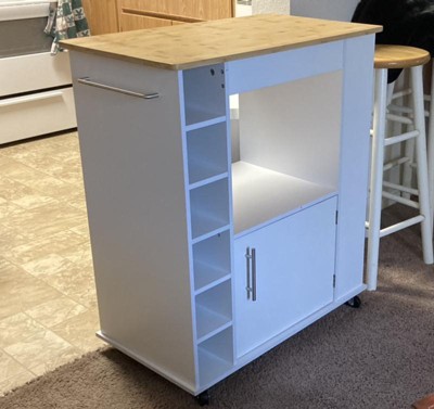 This kitchen Rolling cart is very nice, I like it very much! It’s perfect for my apartment. I love the countertop & the color of the whole cart. I like how it is set up with different shelves & the enclosed cupboard. I will store my kitchenware, wine & other things for the kitchen.