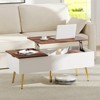Elevate your living room decoration with this innovative lift top coffee table that combines functionality and elegance seamlessly. The desktop can be effortlessly raised to a height of 21”, offering a versatile surface for work or dining. The soft-close gas struts ensure a safe and smooth lifting mechanism for added convenience. With 2 lift table tops and concealed compartments, this table provides ample storage space for your books, laptop, snacks, coffee mug or decorations. The sturdy 5-point support system, including 5 metal legs and non-slip foot pads, ensures stability and durability. Its multi-functional design allows it to transition from a stylish coffee table to a practical working desk effortlessly. The modern chic style, characterized by clean lines and contemporary aesthetics, adds a touch of sophistication to any room.