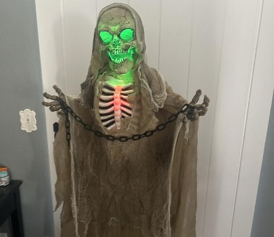 He tall, looks scary and is a great addition to my Halloween decorations! He is super easy to assemble.