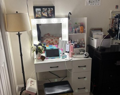 - Large Storage Capacity: Your space will stay organized a wide desktop along with 2 open shelves, 1 large drawer under the desktop, 3 small drawers and a hair dryer rack. Table dimension: 37" x 16" x 54.5" (L x W x H).