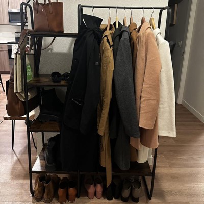 This garment rack looks absolutely great ! But I will say it was difficult to build: the metallic bars were slightly wider than the shelves which made it almost impossible to screw everything in... I could only screw in 2-3 out of 4 screws for each shelf so the structure is a little wonky but it still works.