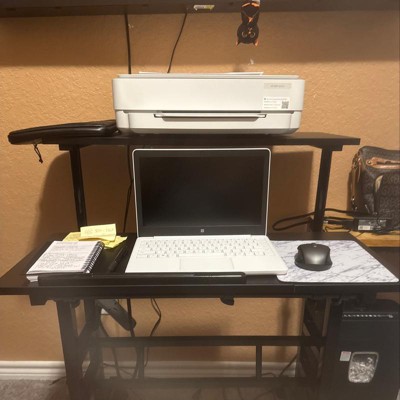 This mobile standing desk with 2 individual platforms is specifically designed for a healthier working life. Thanks to the rotating knob, you can adjust the height of the upper desktop (28.5''-49.5'') and lower desktop (28.5''-46'') separately to reduce muscle tension and improve your efficiency. The spacious desktop with rich storage capacity offers additional room for office supplies. What's more, the front desktop with titling design keeps your laptop at eye level for remarkable comfort. The baffle prevents items from accidentally slipping off. The 360° swivel casters (2 are lockable) ensure extra mobility and safe placement. Made of high grade MDF and steel, this sit-to-stand desk can be used for a long time without breaking.