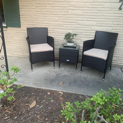 The set was easy to put together, look pretty and is pretty comfortable for a small not heavy person . I use it at the front porch as decorative addition and small conversation setting, I am happy with the purchase