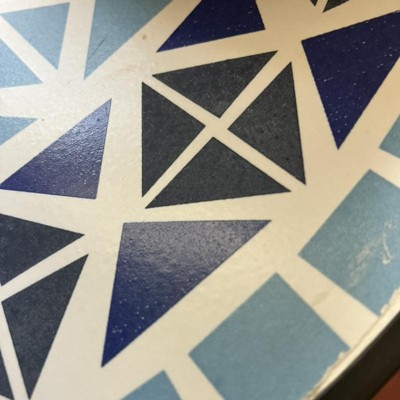 Features round glass top with deep cobalt blue color scheme tile mosaic inlay top