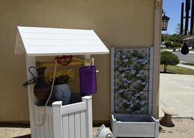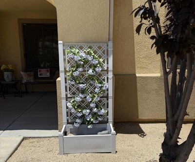 Beautiful vinyl garden planter trellis. Super easy to put together. You will need a rubber mallet. The description and picture said this is white. It is not white but gray. I was initially really annoyed but decided it was better in gray so everything in my front yard is not all in white. Seems pretty durable. But you will meed zip ties to hold the trellises together because it will separate when windy. I also put rocks in the bottom. They were on a super sale making these a really good purchase.