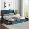 Upgrade to our multifunctional LED bed frame, where supreme functionality meets cutting-edge design. Immerse yourself in a spectrum of 60,000 colors with LED lights that sync to your favorite tunes, all controllable via remote or smartphone for a personalized atmosphere. Brimming with innovative storage solutions, this bed features roll-out drawers and clever side pockets to keep your sleeping space clutter-free. Add a touch of elegance with the chic wingback headboard, designed for space efficiency and flawless integration with your nightstands. The built-in charging station, including multiple outlets, neatly powers all your devices right at your fingertips. Supported by robust wooden slats that handle up to 800 lbs, it comes box-spring-free for a sleek profile. Revolutionize your comfort and convenience today!