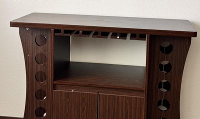 The holes for the wine bottles are small. I ordered a nearly identical bar from Target a few years ago and it fit larger wine bottles. Unfortunately, it was damaged during a move which is why I ordered this one as a replacement. However, the wood color on this one is different and not espresso, and the holes for the wine bottles are tiny. Very disappointed and now stuck with it.