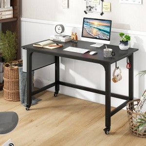 The spacious desktop offers convenient access to your essential work supplies, keeping your workspace organized and clutter-free. Additionally, this computer desk features a storage bag and 2 handy headphone hooks, allowing easy storage for your accessories while maintaining a clean desk surface. You can assemble the storage bag and hooks on either side or not based on your needs. Built on a heavy-duty metal frame, the rolling PC desk promises enhanced stability and long-lasting durability. Moreover, 2 lockable casters allow you to position it wherever needed. Overall, the computer desk on wheels provides practical solution for efficiency and comfort in your workspace.