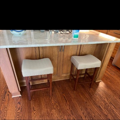 I purchased these stools for my Island table and they look very good! They were easy to put together and quite sturdy. The seat cushion is thick and comfortable.