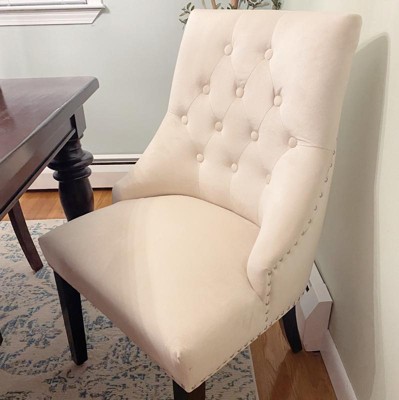 I was nervous since they didn’t have any reviews but so glad I took a chance and bought these chairs. They are exactly what I was looking for! The hardware is silver which is kinda hard to find with beige chairs. The fabric is VELVET which isn’t clear from the description, it just said polyester. But looking at the single chair vs the set, the single pair did outline that they were velvet so I assumed these were the same which I can now confirm for sure that they are. So if you aren’t looking for velvet these are not for you! But they are perfect and I love them